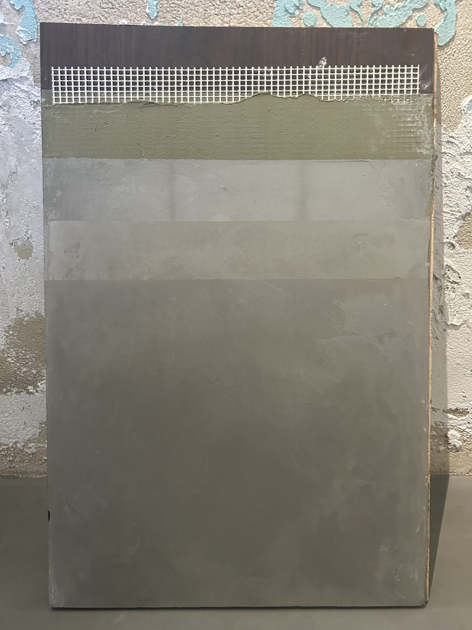 フローリング→ベース材→メッシュ→ベース材→マイクロセメント×2回→防水材3種